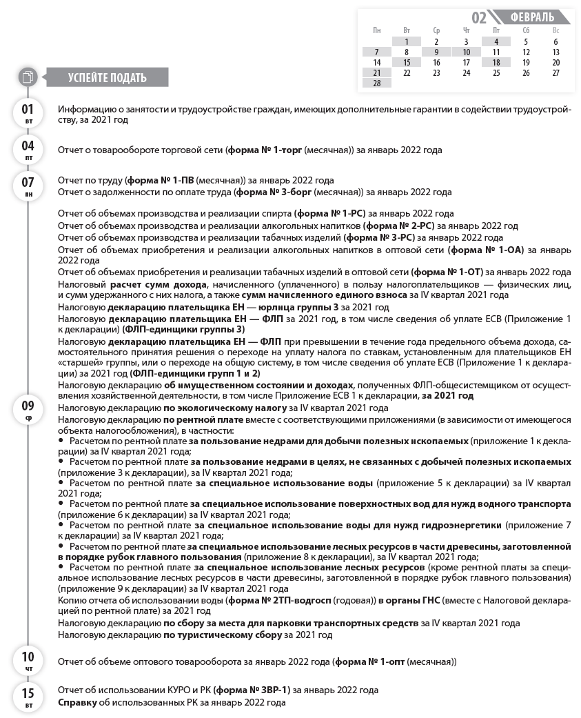 Календарь бухгалтера и ФЛП на февраль 2022 года