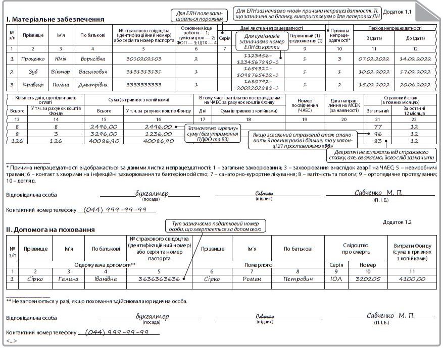Додаток 1.1 Тут наводиться розшифровка інформації про нараховані допомоги щодо кожної застрахованої особи.