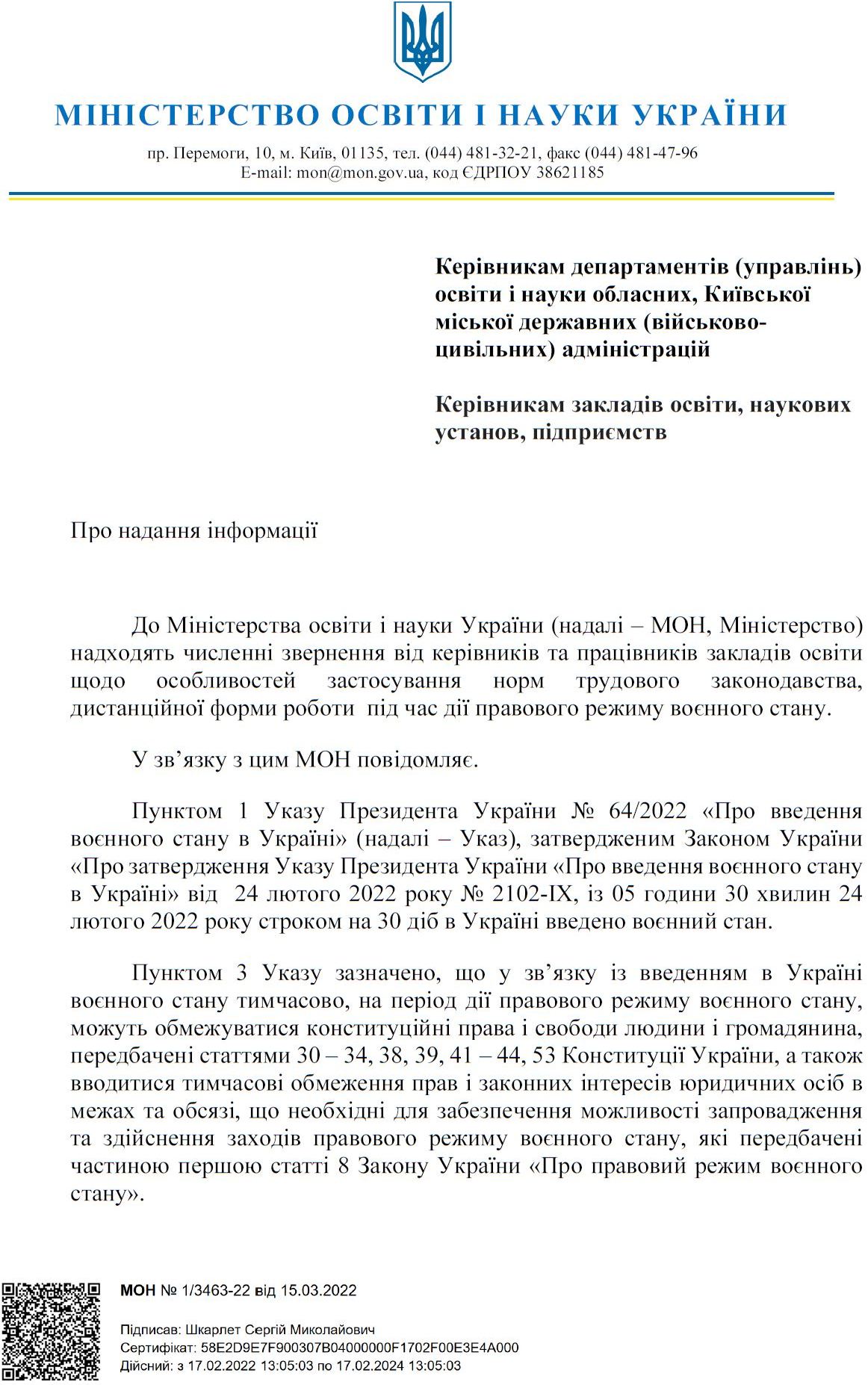 (Лист МОН від 15.03.2022 р. № 1/3463-22)