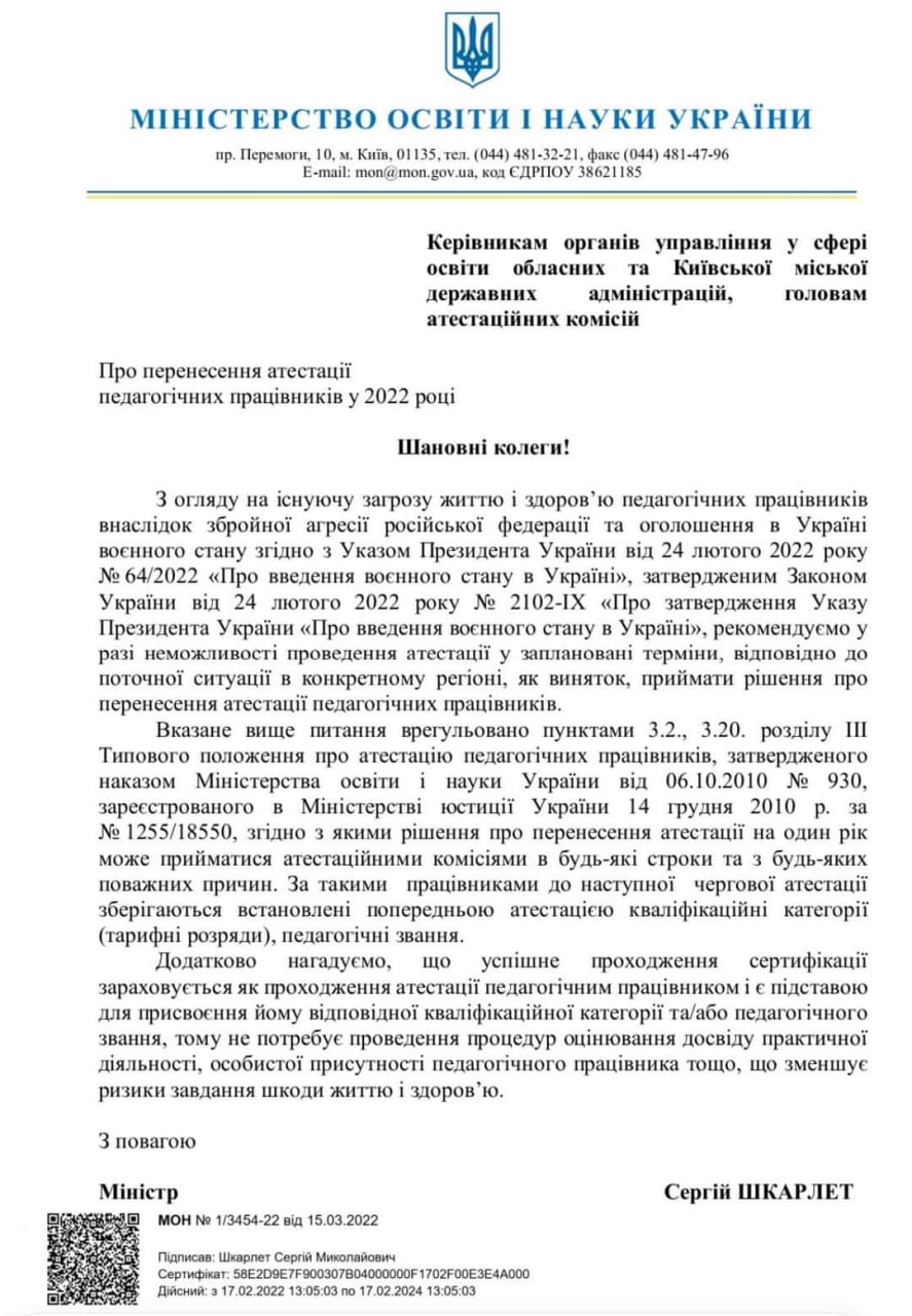 ВАЖЛИВО! При цьому обов’язково необхідно оформити протокол засідання атестаційної комісії, написати відповідний наказ про збереження для педагогічних працівників кваліфікаційної категорії (тарифного розряду), педагогічного звання до наступної атестації. Бажано надіслати копію протоколу та наказу тим педагогічним працівникам, які в умовах воєнного стану вимушено знаходяться в іншій місцевості. Якщо ж атестаційна комісія не може функціонувати, навіть дистанційно, то, на нашу думку, в умовах воєнного стану достатньо буде наказу керівника закладу освіти про перенесення строків атестації.