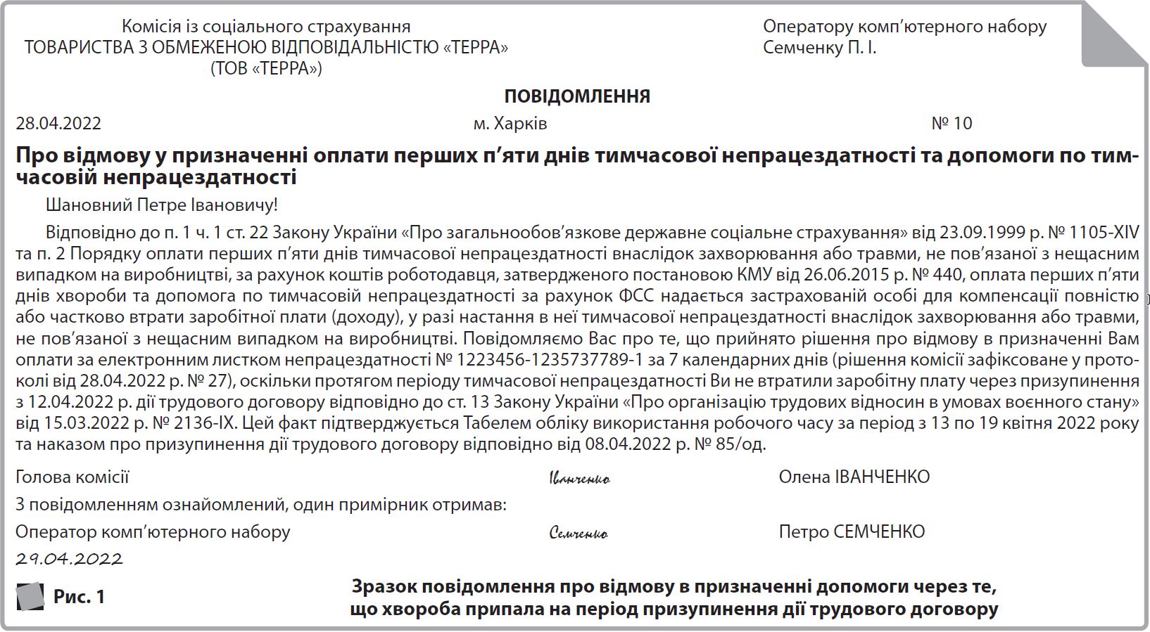 - працівнику слід надати повідомлення про відмову у виплаті лікарняних з обґрунтуванням причин не пізніше 5 к. дн. після винесення відповідного рішення. Повідомлення складається у довільній формі і може бути, наприклад, такого змісту, як наведено на рис. 1;