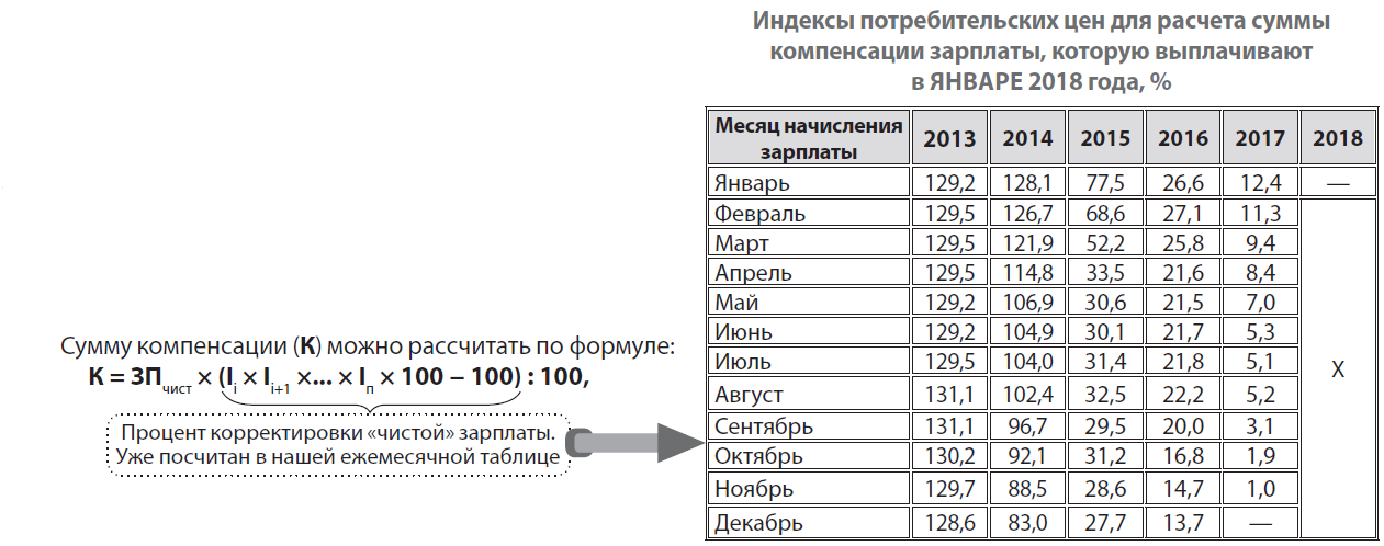 4) если в месяце выплаты задолженности индекс потребительских цен (далее — ИПЦ) нарастающим итогом превысил 100 %, работодатель должен начислить компенсацию. Если ИПЦ меньше 100 %, компенсацию не начисляют, а выплачивают лишь задолженность;