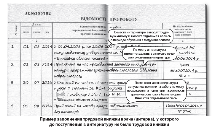 Для выпускников негосударственных и государственных высших медицинских (фармацевтических) заведений, обучавшихся за средства юридических или физических лиц или собственные средства, записи в трудовые книжки о зачислении на учебу в интернатуре и отчислении в связи с окончанием вносятся учебным заведением при условии, что выпускники имеют трудовые книжки. Выпускникам, не имеющим трудовых книжек, эти записи вносятся в трудовые книжки уполномоченным органом по месту будущей работы при оформлении трудовой книжки на основании извлечений из приказов учебного заведения о зачислении и отчислении из интернатуры.