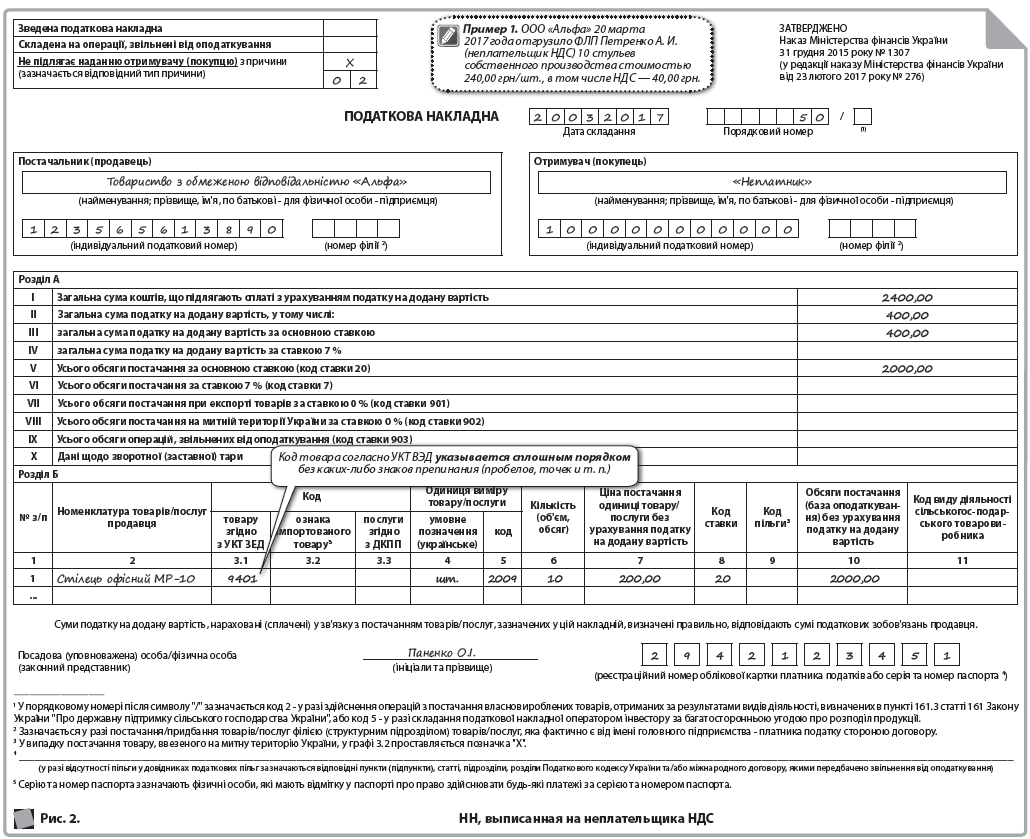 В строке «Постачальник (продавець)» указываются наименование (П. І. Б.) нерезидента и через запятую — страна, в которой зарегистрирован продавец (нерезидент). В строках, отведенных для заполнения данных покупателя, получатель (покупатель) приводит собственные данные |