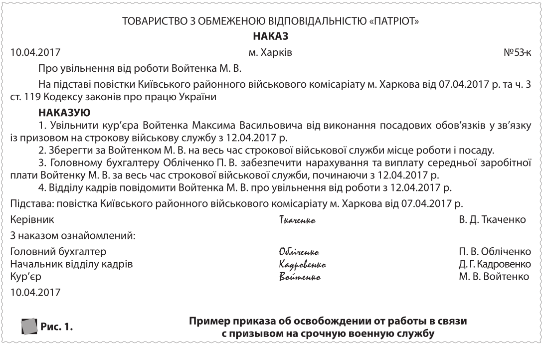 На основании повестки работодатель издает приказ об освобождении работника от работы в связи с призывом на срочную военную службу (см. рис. 1). А вот копию военного билета работник предоставит уже после окончания такой службы.