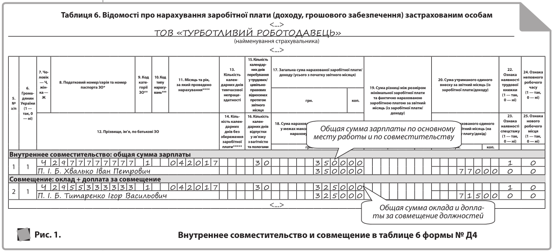 В таблице 6 общую сумму зарплаты, начисленную по основному месту работы и по совместительству, отражайте в одной строке. В вашем случае в реквизитах 17 и 18 отражайте общую зарплату в размере 3500,00 грн, в реквизите 21 — сумму начисленного на нее ЕСВ в размере 770,00 грн. При этом в реквизите 22 проставляйте «1», поскольку трудовая книжка работника находится на вашем предприятии (см. рис. 1 на с. 37).