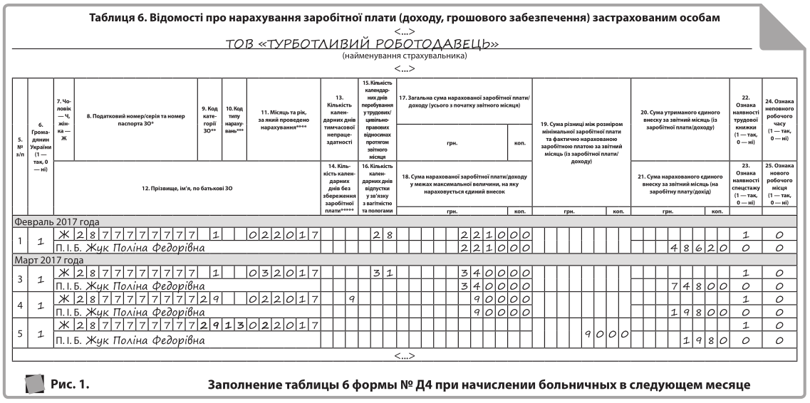 Март 2017 года. Уже обработан листок нетрудоспособности, по которому начислено 900,00 грн пособия за дни временной нетрудоспособности в феврале. Эту сумму для целей определения базы ЕСВ относим к февралю. В таблице 6 формы № Д4 за март это пособие показываем в отдельной строке, указав в реквизите 11 месяц февраль. Сумму пособия (900,00 грн) переносим в строки 1.4 и 2.1 таблицы 1 формы № Д4.
