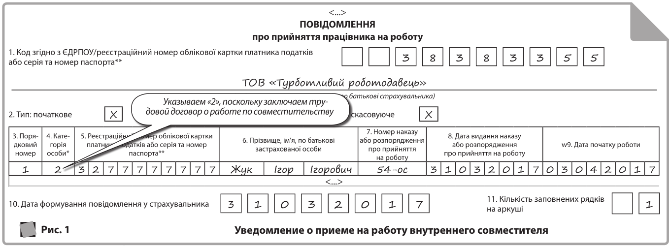 Как заполнить Уведомление о приеме на работу внутреннего совместителя см. на рис. 1. Заметьте, что в реквизите 4 «Категорія особи» нужно указать «2» (наемные работники без трудовой книжки), несмотря на то, что фактически трудовая книжка внутреннего совместителя находится у вас. Дело в том, что вам нужно проинформировать фискалов о заключении нового трудового договора о работе именно по совместительству.