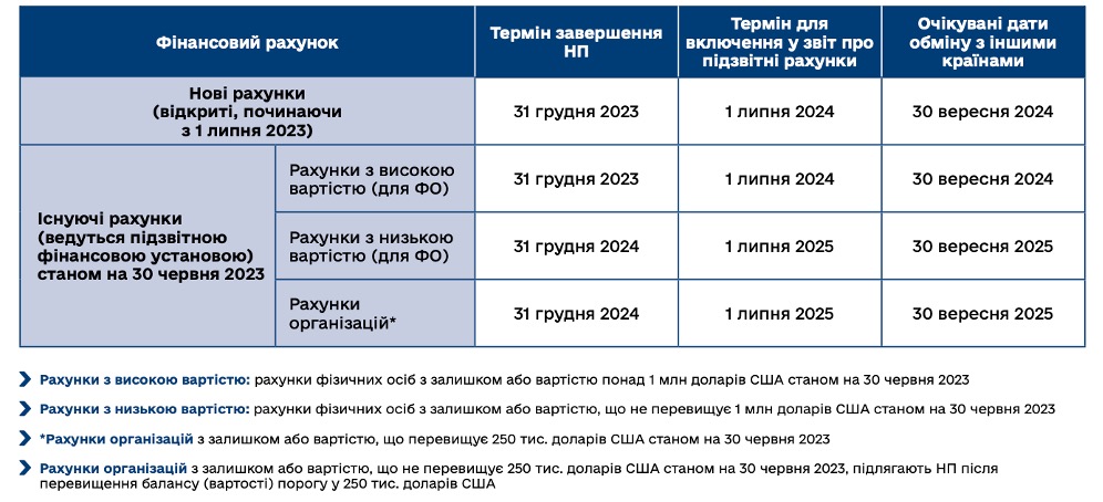З 01 липня 2023 року законопроєкт вимагає від підзвітних фінансових установ України застосовувати заходи належної перевірки до фінансових рахунків для встановлення того, чи підлягають рахунки автоматичному обміну (чи є рахунки підзвітними). Стандарт CRS містить окремі правила належної перевірки для рахунків відкритих до та починаючи з 01 липня 2023 року. Відтак, за часом відкриття, фінансові рахунки поділяються на «нові рахунки» та «існуючі рахунки». Залежно від цього встановлено окремі правила належної перевірки рахунків та строки для завершення цієї перевірки.