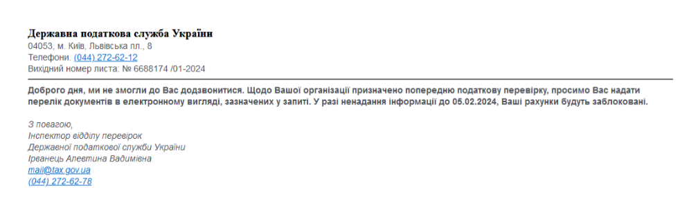 До Державної податкової служби України надходять повідомлення від платників податків про отримання ними листів нібито від імені податкових органів з темою листа «Запит ДПСУ (Вимога)» та вмістом листа «Доброго дня, ми не змогли до Вас додзвонитися. Щодо Вашої організації призначено попередню податкову перевірку, просимо Вас надати перелік документів в електронному вигляді, зазначених у запиті. У разі ненадання інформації до 05.02.2024, Ваші рахунки будуть заблоковані.»