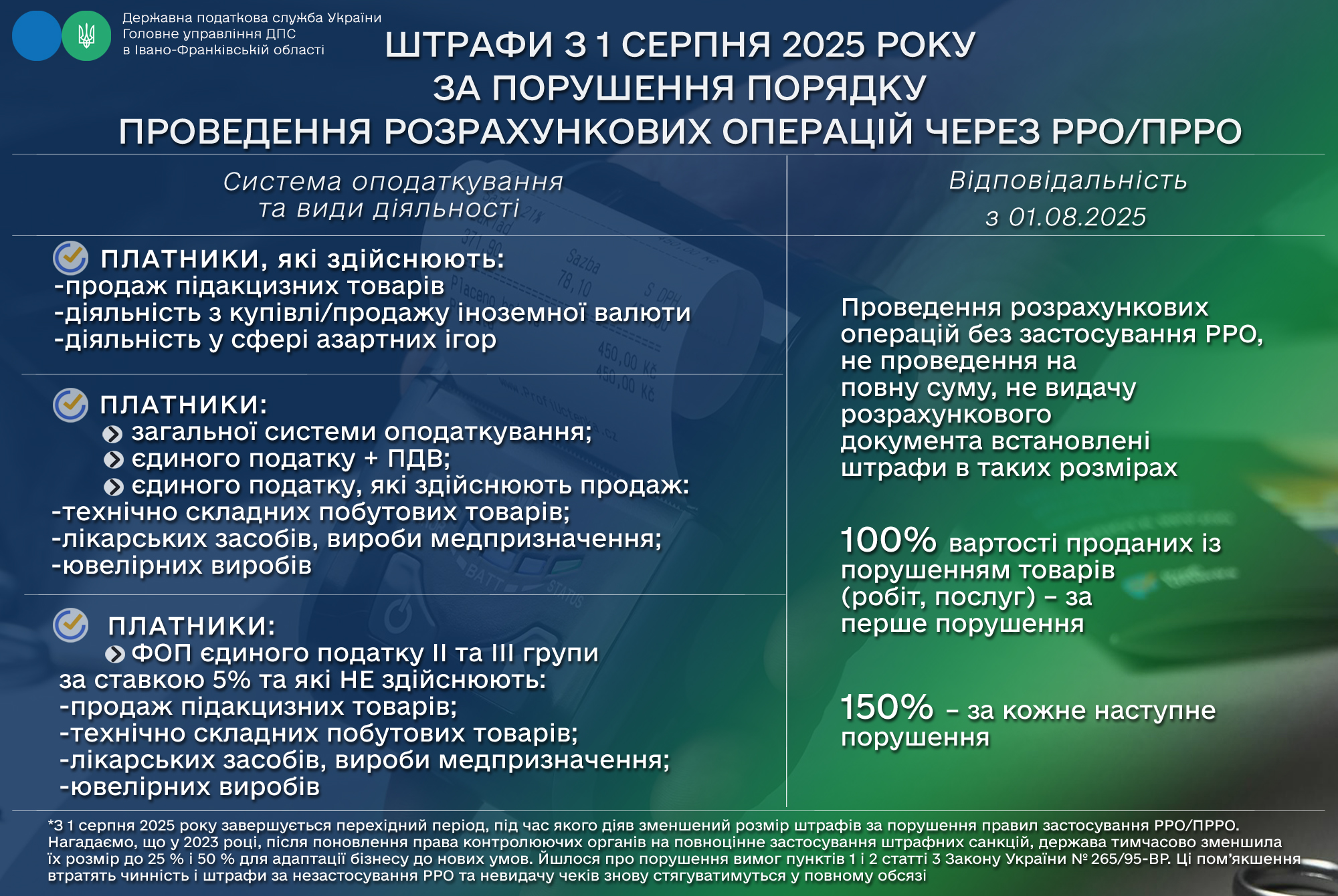 Листівка "Штрафи з 1 серпня 2025 року за порушення порядку проведення розрахункових операцій через РРО/ПРРО"