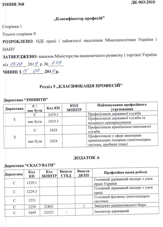Мінекономрозвитку на своему сайті опублікував наказ від 15.02.2019 № 259 «Про затвердження Зміни № 8 до національного класифікатора ДК 003:2010 «Класифікатор професій».
