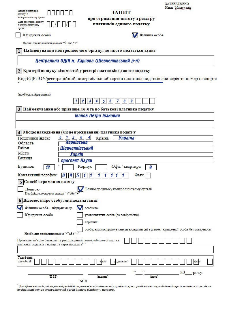 Зразок заповнення запиту про отримання витягу з реєстру платників єдиного податку.